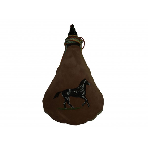 Bota de vino, de piel de ternera en color marron, bordada, con interior de latex. Diseño caballo.