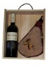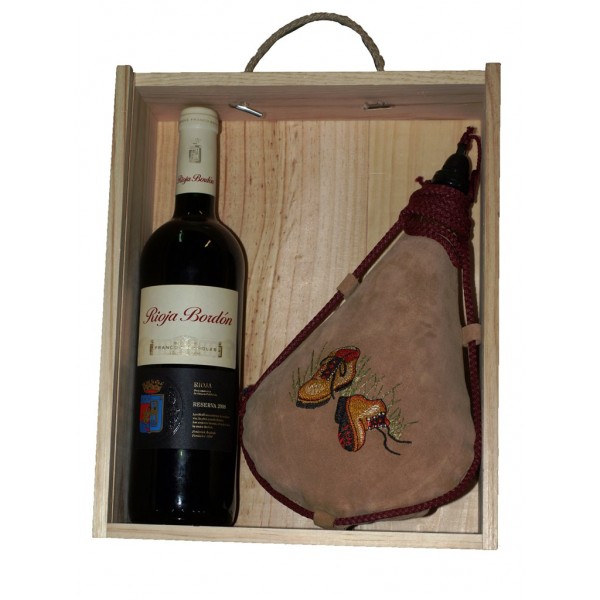 Estuche de maderea compuesto de bota de vino, de piel de ternera bordada, con interior de latex. Diseño Botas Monte. Botella de vino Rioja, Reserva de bodegas DOC.